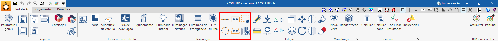 No bloco “Iluminação” da barra de ferramentas principal do separador “Instalação”, encontram-se as opções para dispor automaticamente conjuntos de luminárias no modelo utilizando diferentes tipos de distribuição: