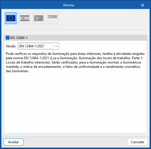 Permite importar os requisitos de iluminação exigidos pela norma EN 12464-1 (“Iluminação. Iluminação dos locais de trabalho. Parte 1: Locais de trabalho interiores”) para áreas interiores, tarefas e atividades selecionadas.