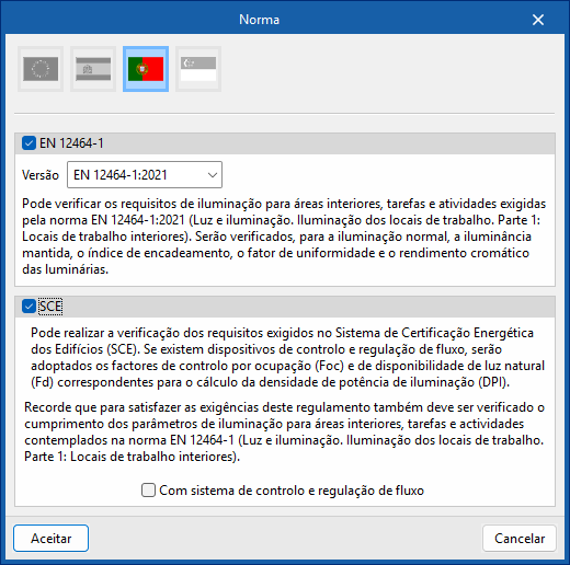 Permite importar os requisitos de iluminação exigidos pela norma EN 12464-1 (“Iluminação. Iluminação dos locais de trabalho. Parte 1: Locais de trabalho interiores”) para áreas interiores, tarefas e atividades selecionadas. - SCE (opcional)