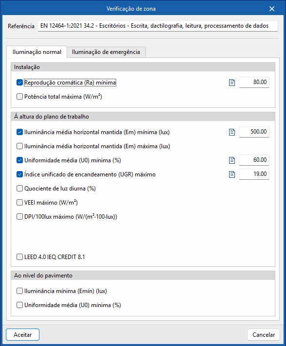 Permite ativar e definir os valores de verificação dos seguintes parâmetros, correspondentes ao cálculo da iluminação normal. Além disso, é possível adicionar um texto descritivo para cada verificação:- Instalação