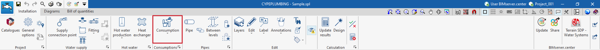 Dentro de "Instalação" do separador "Water Systems", no grupo "Consumos" da barra de ferramentas principal, encontram-se as opções que permitem introduzir os consumos da instalação de abastecimento de água: