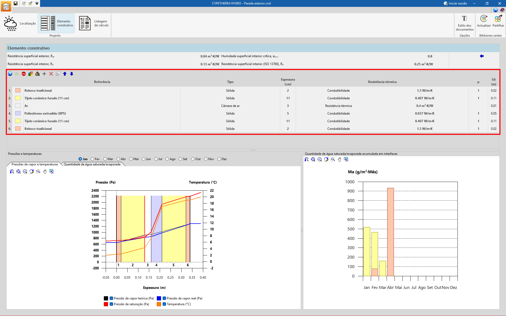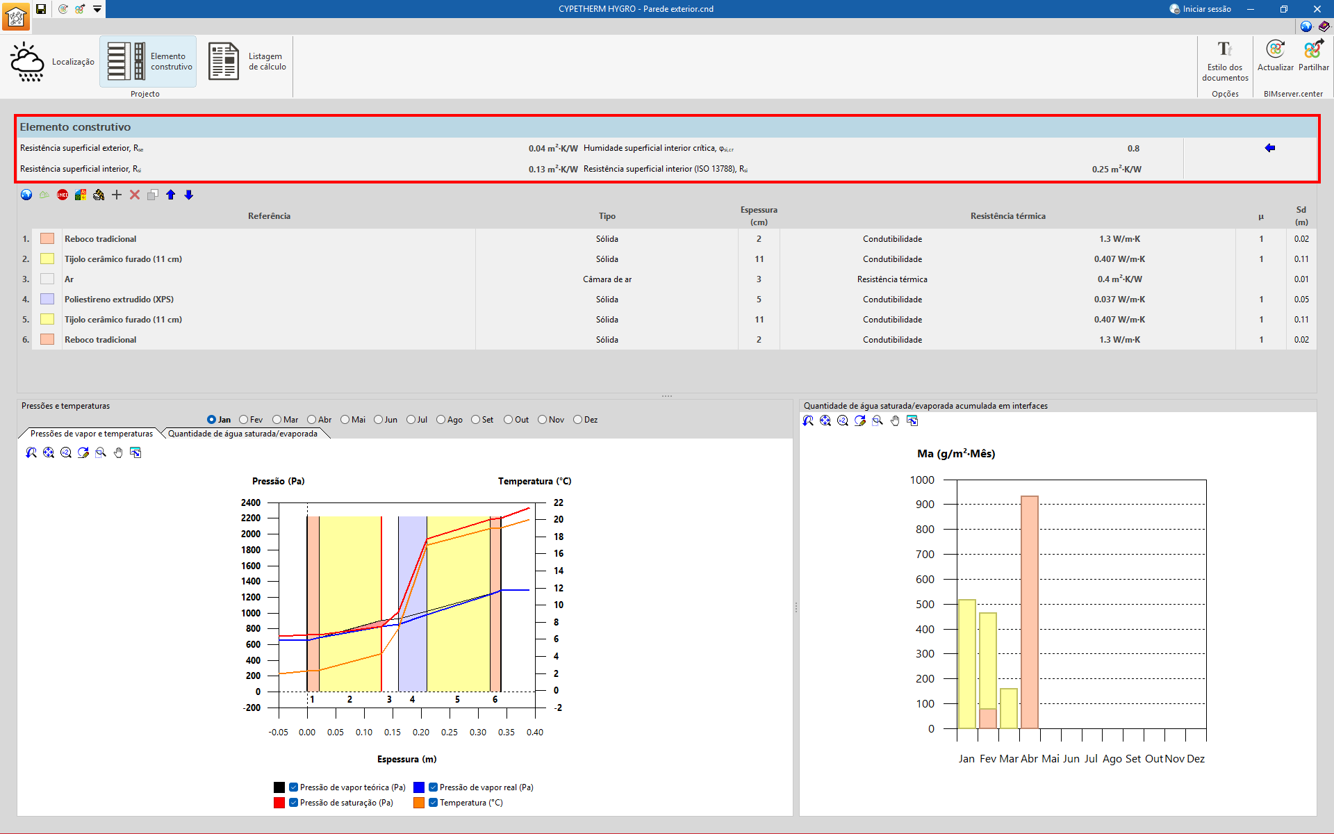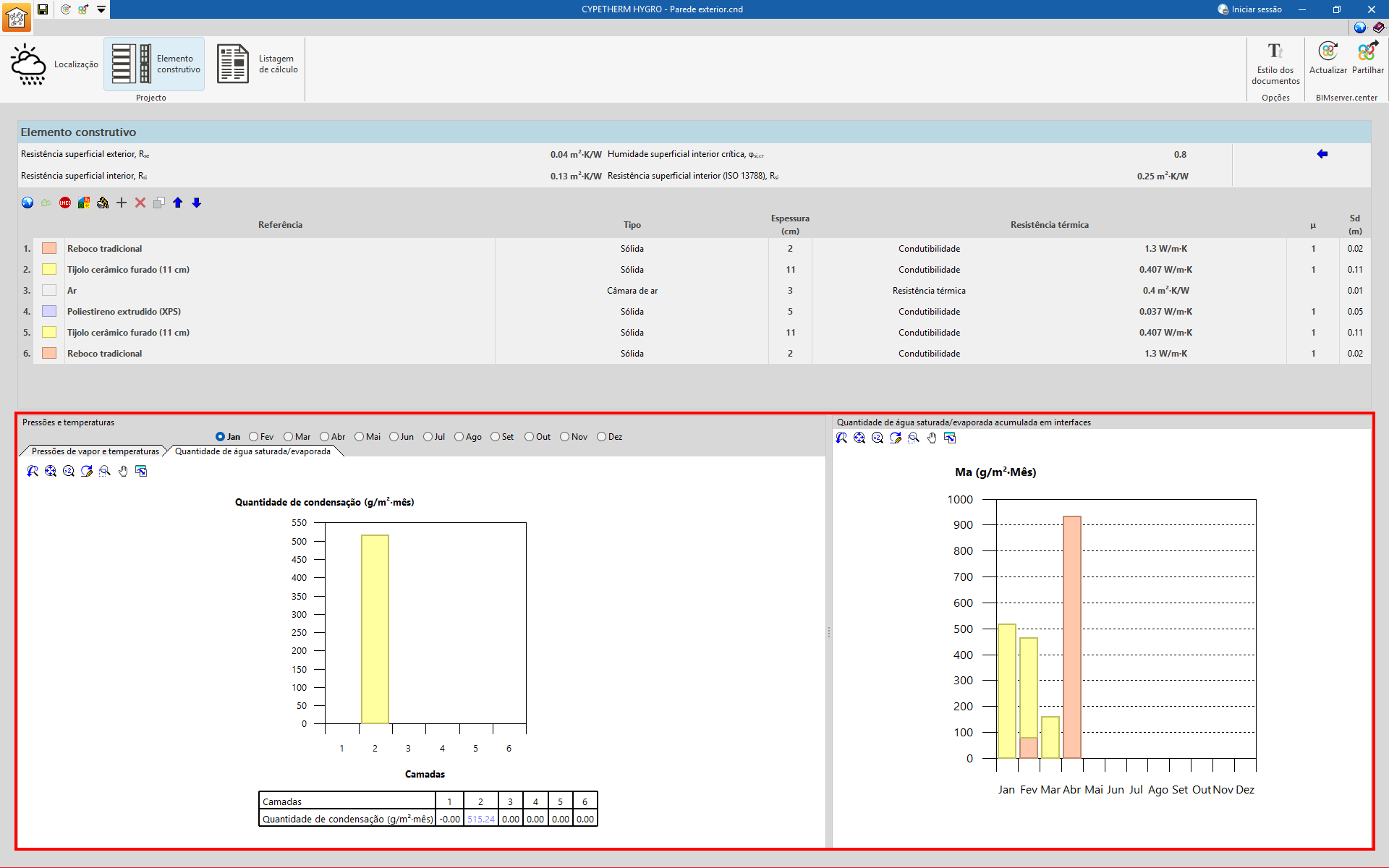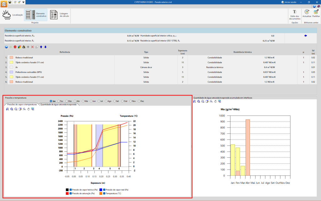 Se existirem condensações intersticiais, o programa mostra um gráfico da “Quantidade de água saturada/evaporada” (g/m2.mês) para cada camada e período de análise. Mais à direita, no caso de um cálculo com valores mensais, aparece a “Quantidade de água saturada/evaporada acumulada nas interfaces” mês a mês.