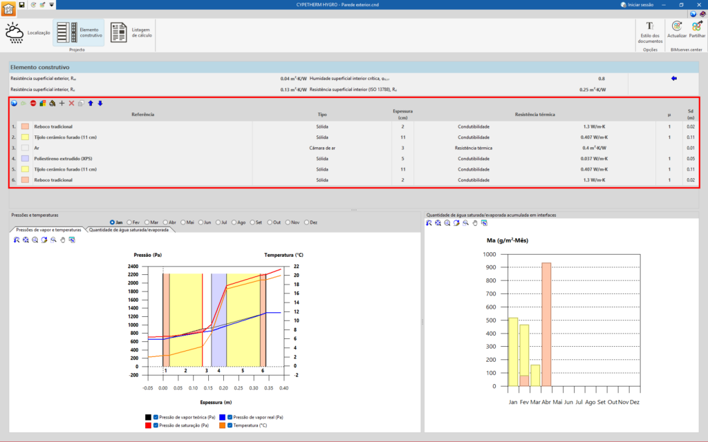 A partir da secção “Elemento construtivo” da interface geral do programa, define-se o modelo do elemento construtivo que se pretende analisar, introduzindo as diferentes camadas que o formam. Nesta interface, é possível modificar a ordem das camadas de material ou as suas propriedades para reduzir ou evitar o aparecimento de condensações, e consultar os resultados imediatamente no ecrã.