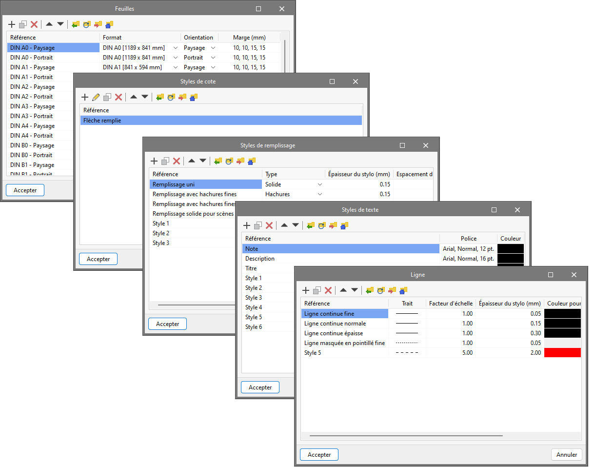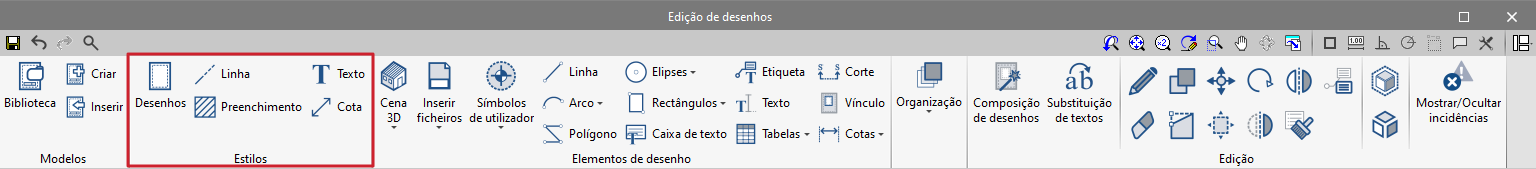 No bloco "Estilos" é possível criar bibliotecas personalizadas de folhas, linhas, textos, preenchimentos e cotas. A partir de cada opção é possível criar novos estilos.