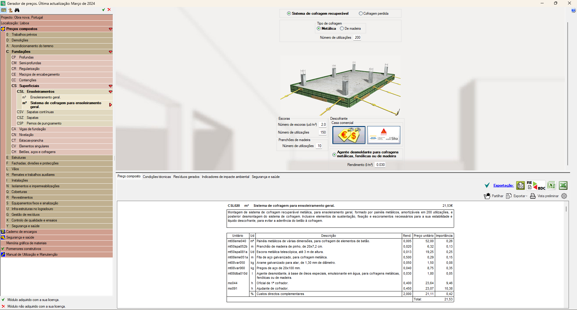 A secção "Preços compostos" permite principalmente a visualização e exportação de unidades de obra.