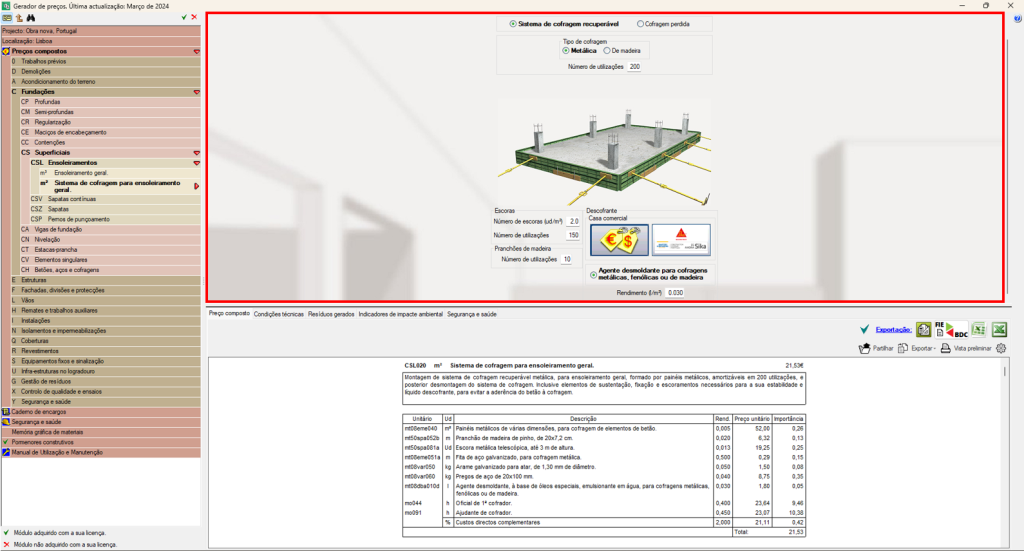 A interface desta secção está subdividida em três partes. À esquerda está o menu lateral em árvore e à direita, dividido em dois, está o sistema de seleção paramétrico na parte superior e a unidade de obra selecionada na parte inferior.