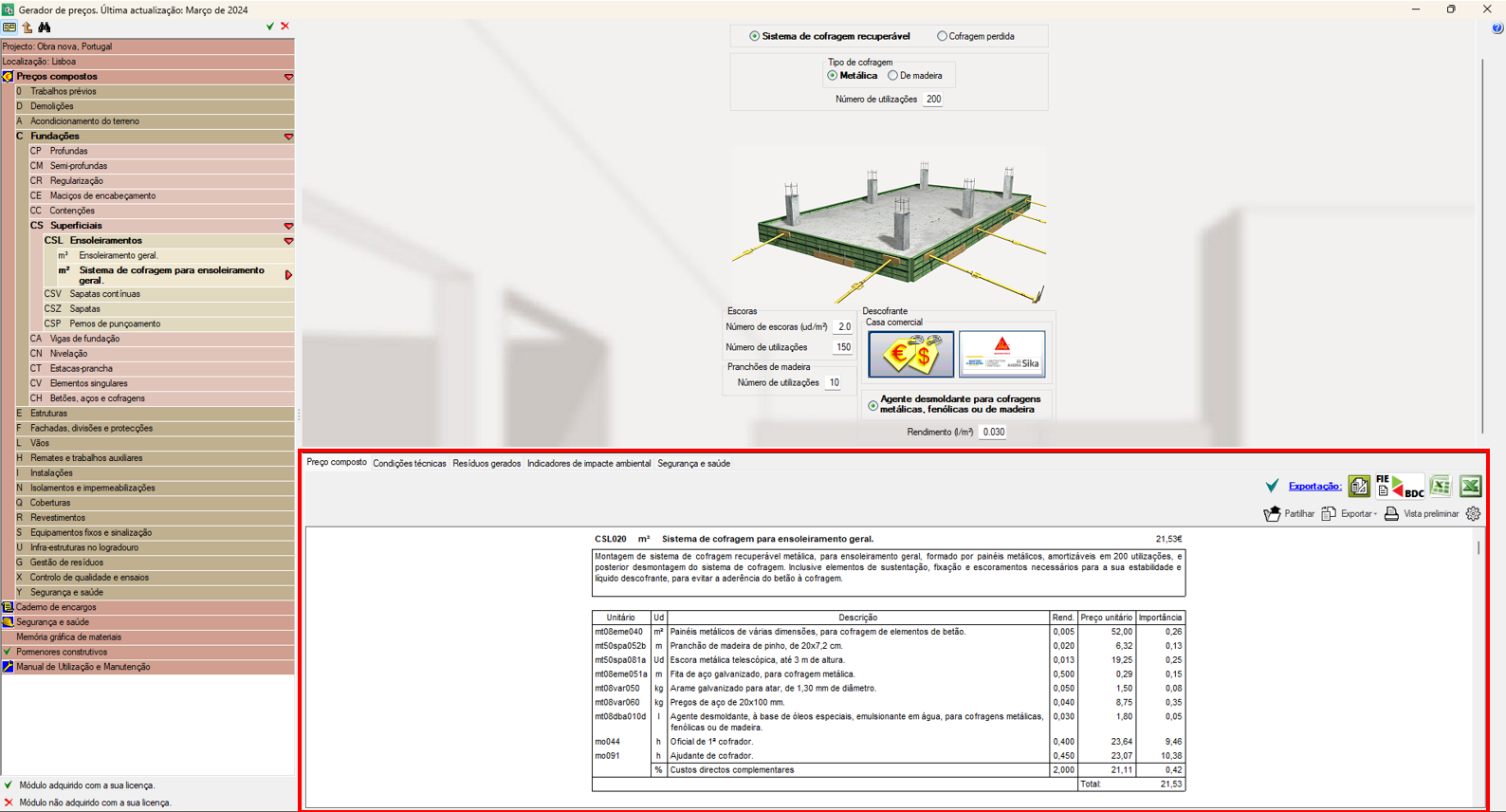 A unidade de obra pode ser visualizada com a sua composição na área central ou exportada a partir das ferramentas do canto superior direito.