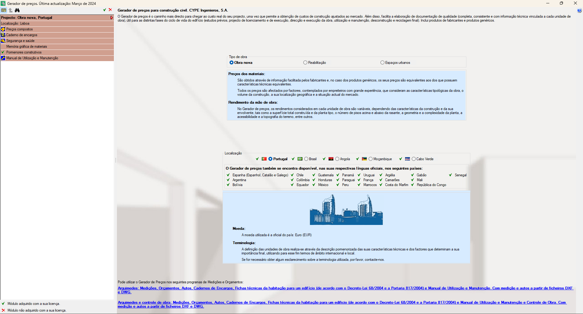 No menu em árvore é necessário selecionar previamente o tipo de obra, a sua localização e o banco de preços a utilizar.