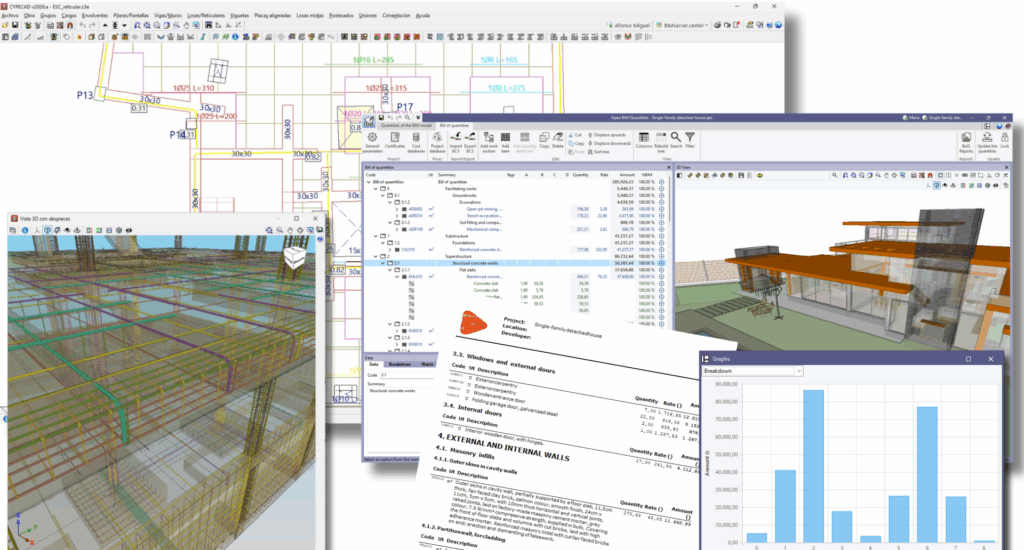 The models, defined using the IFC standard and developed in CYPECAD or CYPE Architecture, can be directly connected to Open BIM Quantities to establish customised quantity criteria, converting the data of the BIM model elements into detailed and precise items. This linking can generate a multitude of reports such as quantities, bills of quantities, specifications, environmental impact indicators, certificates, among others. These qualities optimise and facilitate the economic planning and project documents.