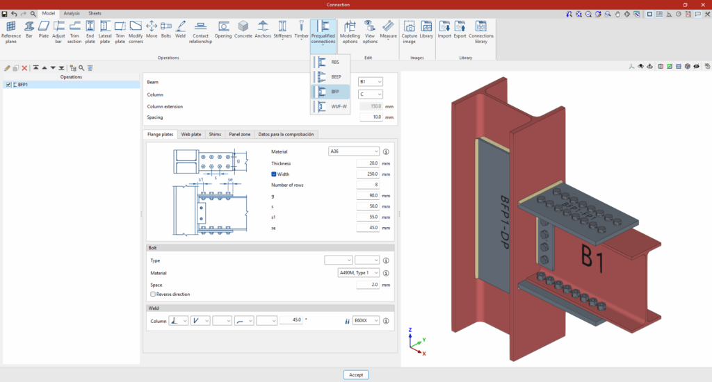 As of version 2026, CYPE Connect and StruBIM Steel programs incorporate specific prequalified connection operations following AISC 358.