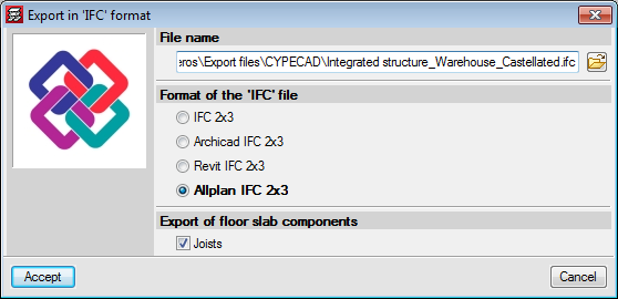 The 2013 version and successive versions will count with an advance export to IFC format (Industry Foundation Classes). Included in this export are the various components of the structural elements which are designed in CYPECAD. For example, joists, forms, infilled zones of the different types of floor slabs; the elements constituting the steel joints, etc. This way, users will be able to visualise in their CAD/BIM program, all the components of the structural elements which are designed in CYPECAD.