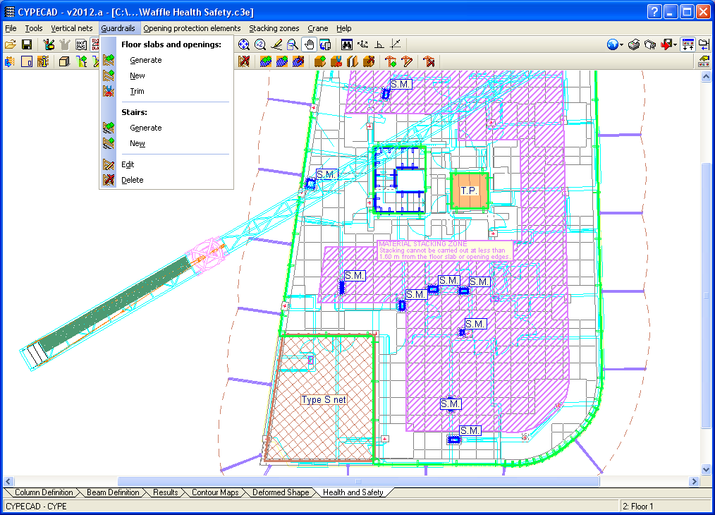 The 2012.a version of CYPECAD includes an extra tab at the bottom of the screen. Along with the other five tabs (Column Definition, Beam Definition, Results, Contour Maps and Deformed Shape), the Health and Safety tab has been implemented. Upon clicking on it, the user can include the following elements by selecting them from the top menus: