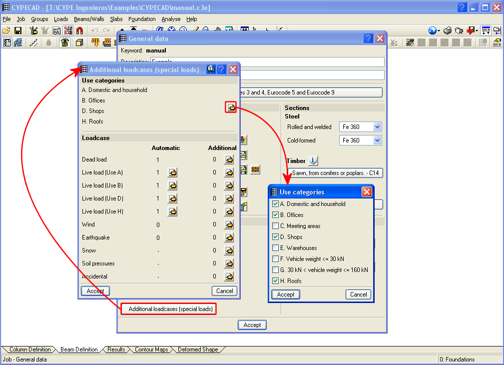For the program, a use category consists of a group of live loadcases, be they automatic or additional, which combine with the other loadcases that have been defined in the job with the same combination coefficients.