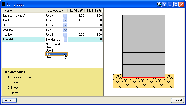 Now in CYPECAD, different use categories can be defined for each floor group of the structure. Examples of use categories include: dwellings, shops, warehouses, garages, etc. The number of use categories the program allows to choose amongst depends on the selected code. For example, the use categories for the Eurocode are: