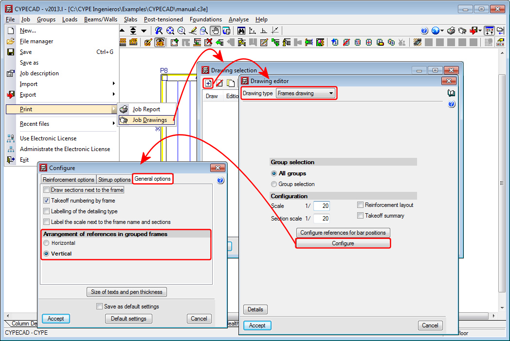 The option: Arrangement of references in grouped frames (File > Print > Job drawings > Add button > Select Frames drawing in “Drawing type” > Configure button > General options tab) has been implemented, which allows for the references of the grouped frames to be placed next to one another (option: Horizontal) or underneath the preceding reference (option: Vertical).
