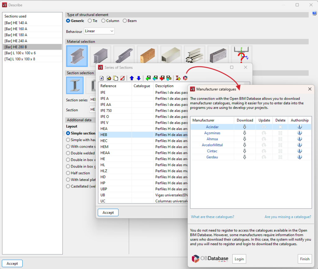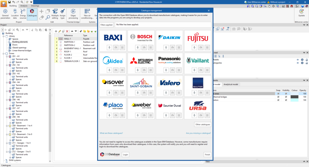 In version 2025.d, the "Catalogue management" option has been added to the toolbar, where the catalogues of the manufacturers of building elements, air-conditioning systems and DHW systems available in the Open BIM Database can be downloaded.