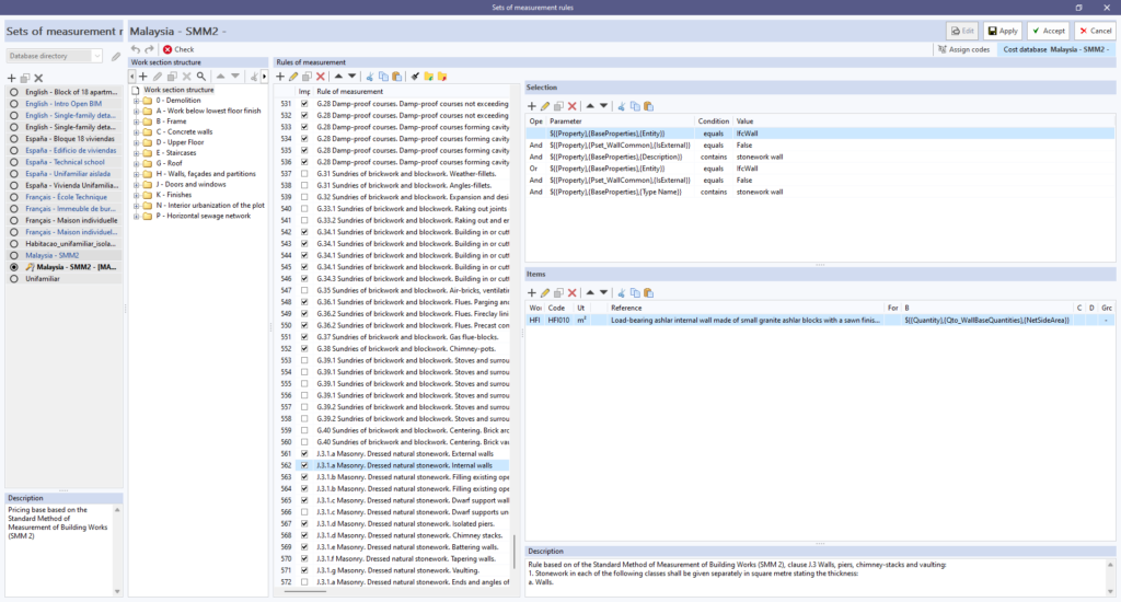 Please note that the cost database is accessed from the "Cost databases" option and the set of rules is accessed from the "Set of measurement rules" option. The cost database contains unclassified and unpriced items, with the items organised according to the work section and sub-work section criteria normally followed in Malaysian bills of quantities. A cost database allows users to assign items to the quantity criteria they consider, in this case, the set of rules has been created for Malaysia, in order to transform the data contained in the elements or components of a BIM model into items.