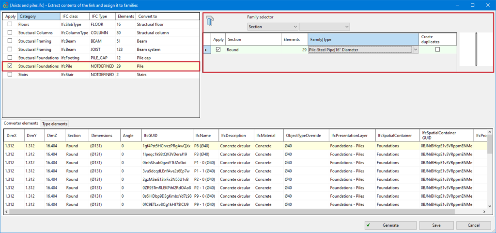 Corresponds to deep foundation elements, specifically piles, which are topped by a pile cap. With this incorporation, these elements can be correctly identified within the IFC model and, subsequently, converted to native elements within Revit.