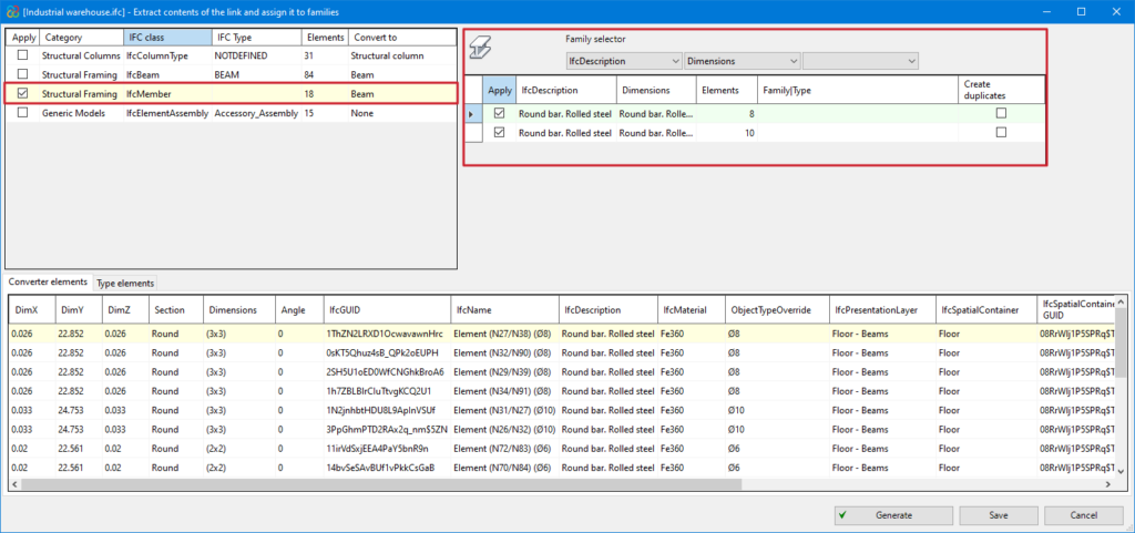 Represents steel bar-type elements that are part of a structural assembly. With its implementation, these bars will be classified as column elements or beam elements, depending on their function within the structure, thus allowing their conversion to native elements without loss of information.