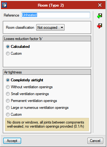 As of the 2016.e version of CYPETHERM Suite, CYPETHERM HVAC LOADS incorporates the calculation of the losses reduction factor, “b” of non-occupied precinct, in accordance with the ISO 13789 code. This way, the program allows users to use user-defined values for each type of precinct or apply the implemented calculation.