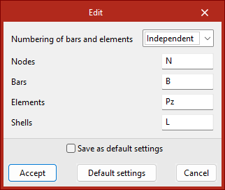 From this dialogue box, it is also possible to define the prefixes for the numbering of "Nodes", "Bars", "Parts" and "Shells", by default N, B, Pz and L. The field can be left empty if you do not wish to define a prefix.