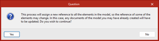 The "Reset" tool can be used to reset the numbering to the current model data. This can be useful if elements have been deleted and no jumps in the numbering are desired. The program will launch a warning informing you of the process to be carried out to confirm.