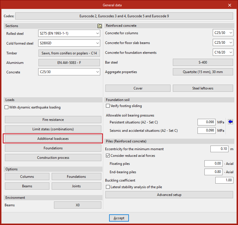 • the loadcases and combinations of loadcases, including the data relating to the seismic action;