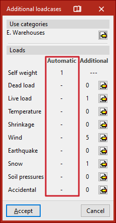 The "Automatic" column shows the loadcases automatically considered by the program, such as the loadcase of the "Own weight" of the structure.
