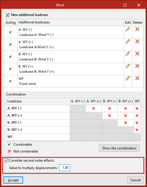 For additional horizontal loads such as in the wind or earthquake loads, the program can "Consider second order effects" by activating the corresponding check box and typing in a "Value for multiplying displacements" to be estimated by the user.