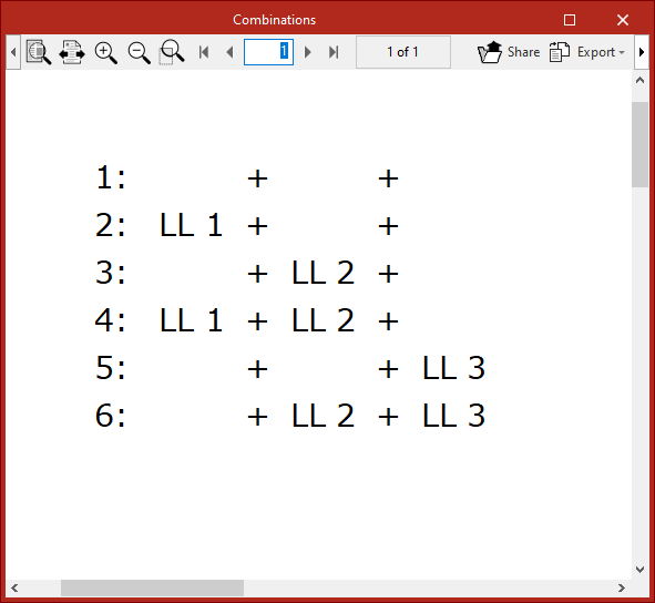 If several additional loadcases are added, the program displays a "Combination" table between different loadcases where their "Combinable" or "Non-combinable" status is indicated. The "Show combination" button is used to list the "Combinatorics" obtained after manipulation of the table.