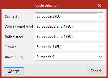 The "Code selection" window is displayed, where the standards associated with the elements of the following materials are chosen: