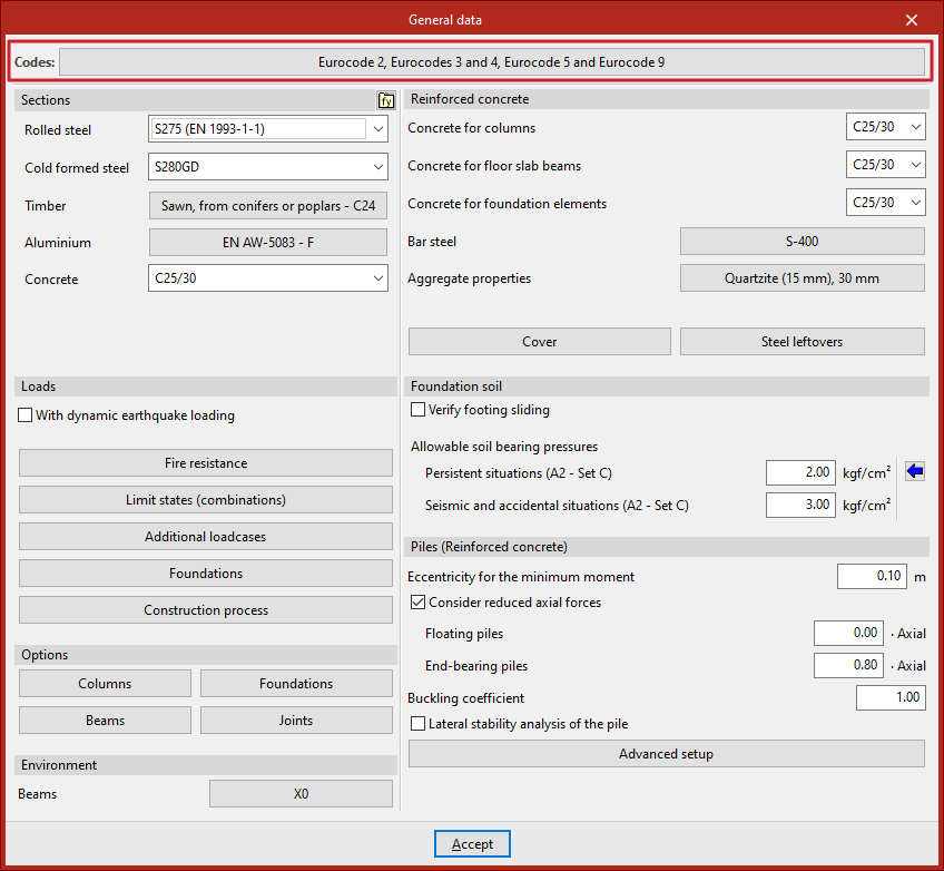 The configuration of the codes used in the analysis of the structure is done in the "Project" tab (in the “Structure” tab), by selecting the "General data" option in the "Project" group of the upper toolbar.