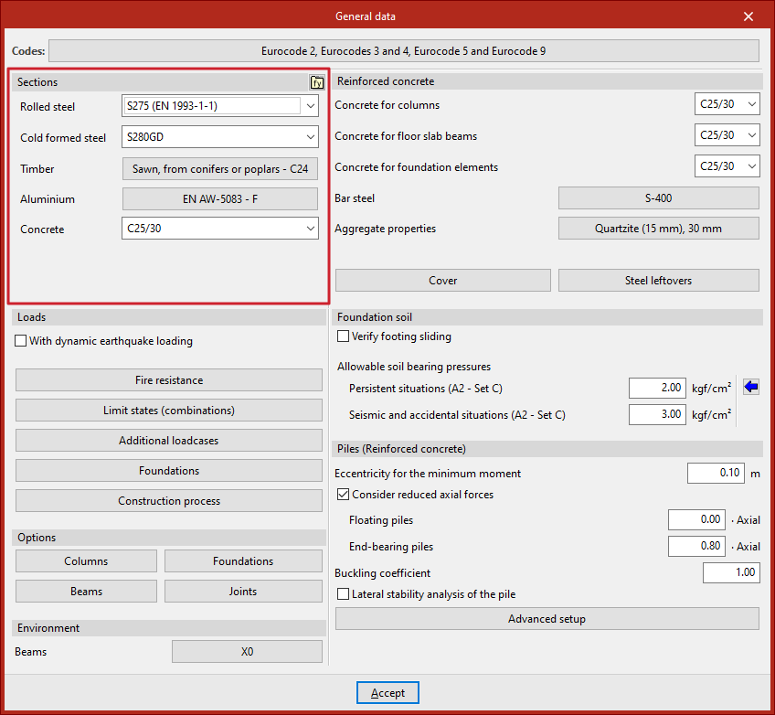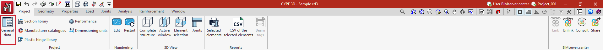 The configuration of the materials of the elements that make up the structure is carried out in the "Project" tab (in the "Structure" tab), by selecting the "General data" option in the "Project" group of the upper toolbar.