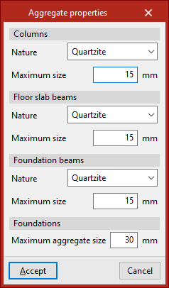 The "Aggregate properties" for each type of element ("Columns", "Floor beams", "Foundation beams" and "Foundations") are specified below.