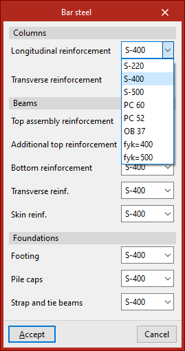 Defines the concrete used by default in the bars entered in the "Structure" tab from the "Column" or "Bar", "Column" option.