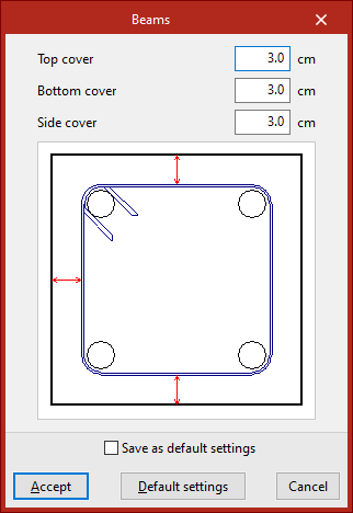 Defines the "Top cover", "Bottom cover" and "Side cover" of beams independently. In all cases, the covers are defined as the distance from the face of the beam to the face of the stirrup bar (geometric cover).