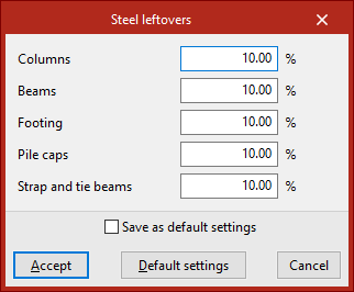 The "Steel leftovers" option can be used to enter percentages associated with steel leftovers or losses in "Columns", "Beams", "Footings", "Pile caps" and "Tie and centring beams", respectively.