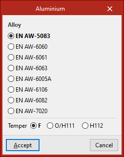 The "Aluminium" section can select the "Alloy" and the "Temper" to be applied to the aluminium elements.