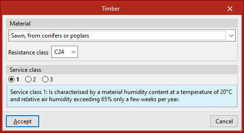 In "Timber", in the "Material" section of the pop-up window, the type of wood and the "Resistance class" associated with the elements of this material are selected. In the following sections, the "Service class" and the "Duration of the loads entered as live loads" are defined for each "Loadcase".