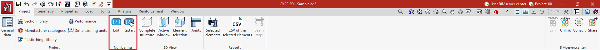 From the "Numbering" group of the "Job" tab the element references (nodes, bars, parts and shells) can be configured according to the user's preference or to reset the numbering according to the current model data: