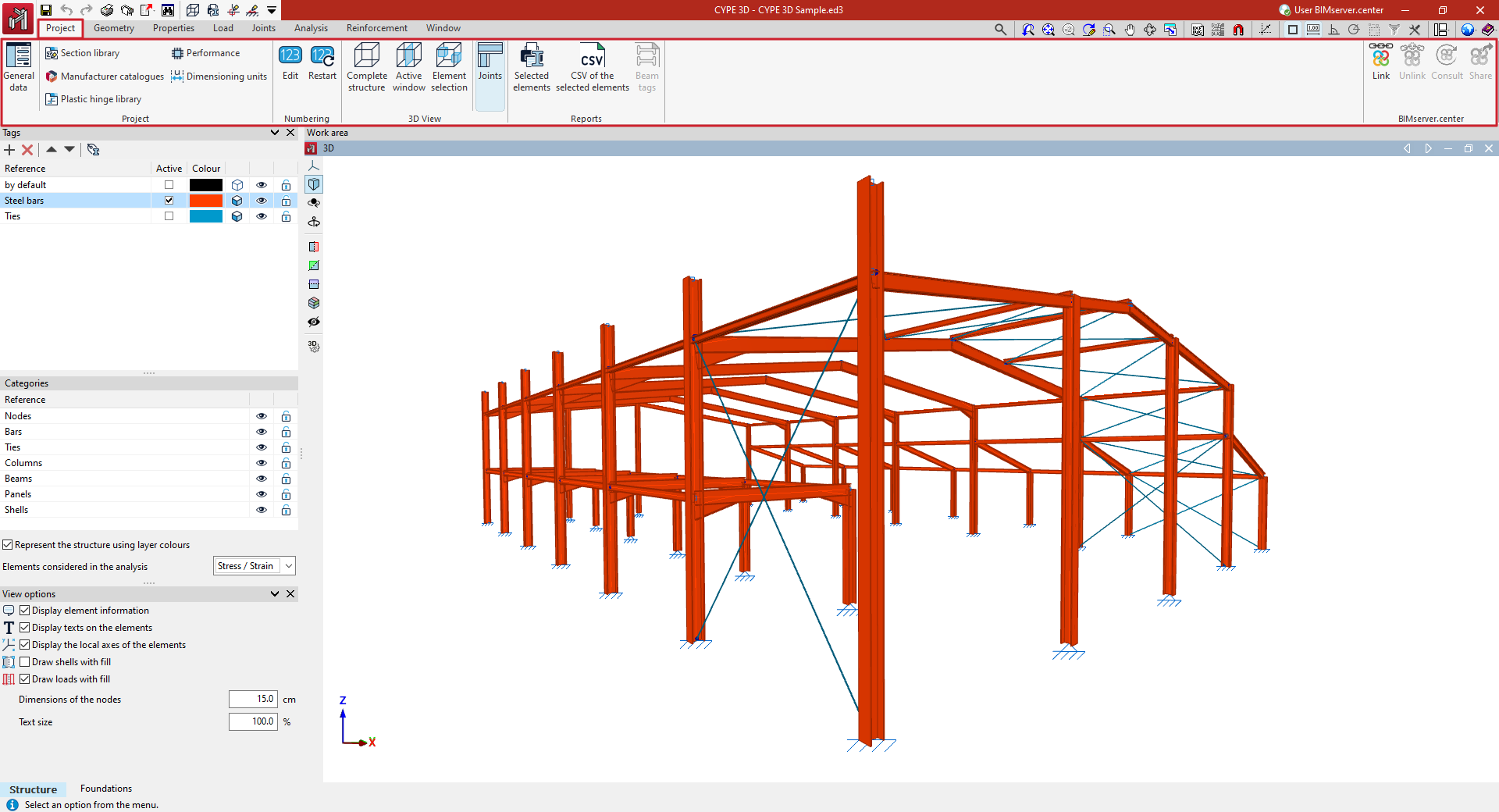 • management of section library, manufacturer catalogues, plastic hinges library, performance options for non-linear analysis and configuration of dimensioning units;