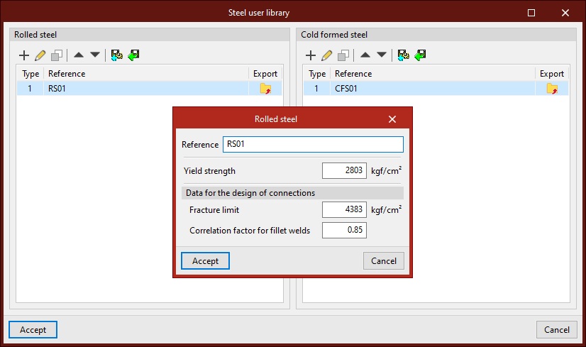 The "Steel user library" option, available in the upper right corner of the "Profiles" section, allows you to create and manage lists of user-defined steel types, either "Rolled steel" or "Cold formed steel".