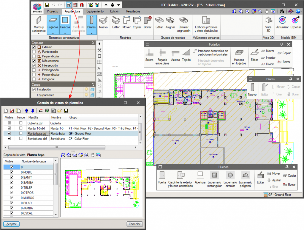 A modelação do edifício no IFC Builder pode ser realizada de raiz, com ou sem a ajuda de plantas no formato DXF, DWG, JPEG ou BMP. A utilização das plantas facilita a introdução manual dos dados.