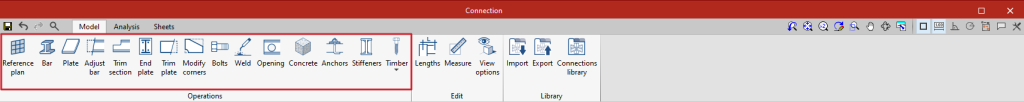 Within the "Model" tab, users can enter a list of operations that are used sequentially to define the elements and geometry of the connection.