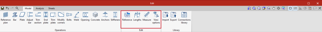The main toolbar contains different features depending on the "Model" or "Documents" tab. You can create project libraries, enter or edit elements, measure model elements, analyse connections, and also number and manage sheets.