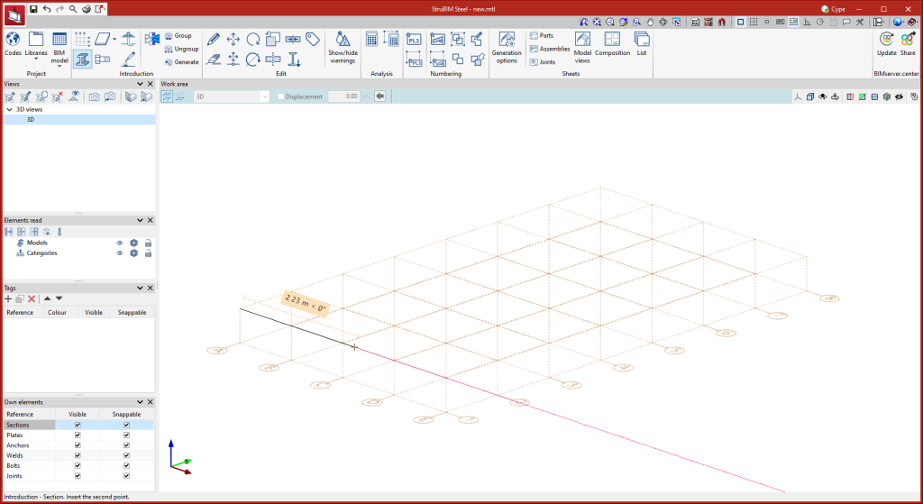 Grids are reference lines that make the geometrical modelling of the structure easier. They can be used during the modelling phase to draw any element, as they can be snapped, just like any other element in the model. Grids and reference lines are particularly useful for placing the bars of a modular structure, or for projects that are being 100% developed in StruBIM Steel without prior import.