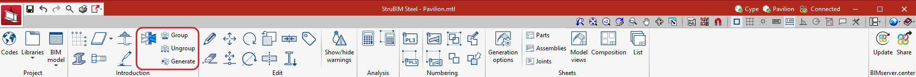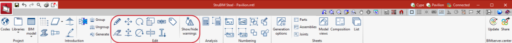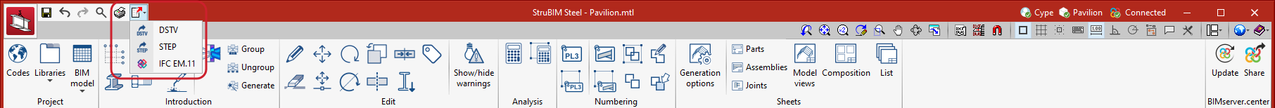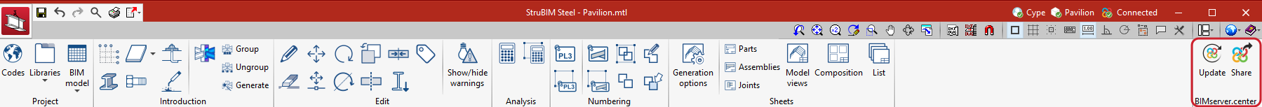 Using the "Share" button, the information contained in the model developed with StruBIM Steel can be exported to BIMserver.center.
