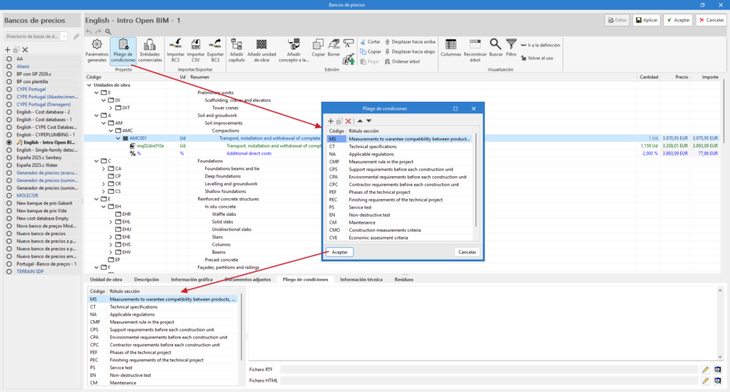 The application allows users to create cost databases from scratch (work section structure, items, breakdowns, etc.), however, it is of greater interest to import databases (or individual concepts) from cost databases developed in accordance with the FIEBDC-3 standard (.bc3).