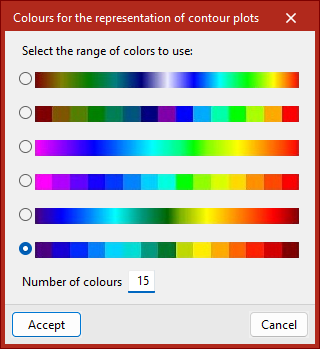 Configures the colour of the contour plot diagrams. The drawing mode with gradient colours or with staggered colours can be selected by setting the number of colours.
