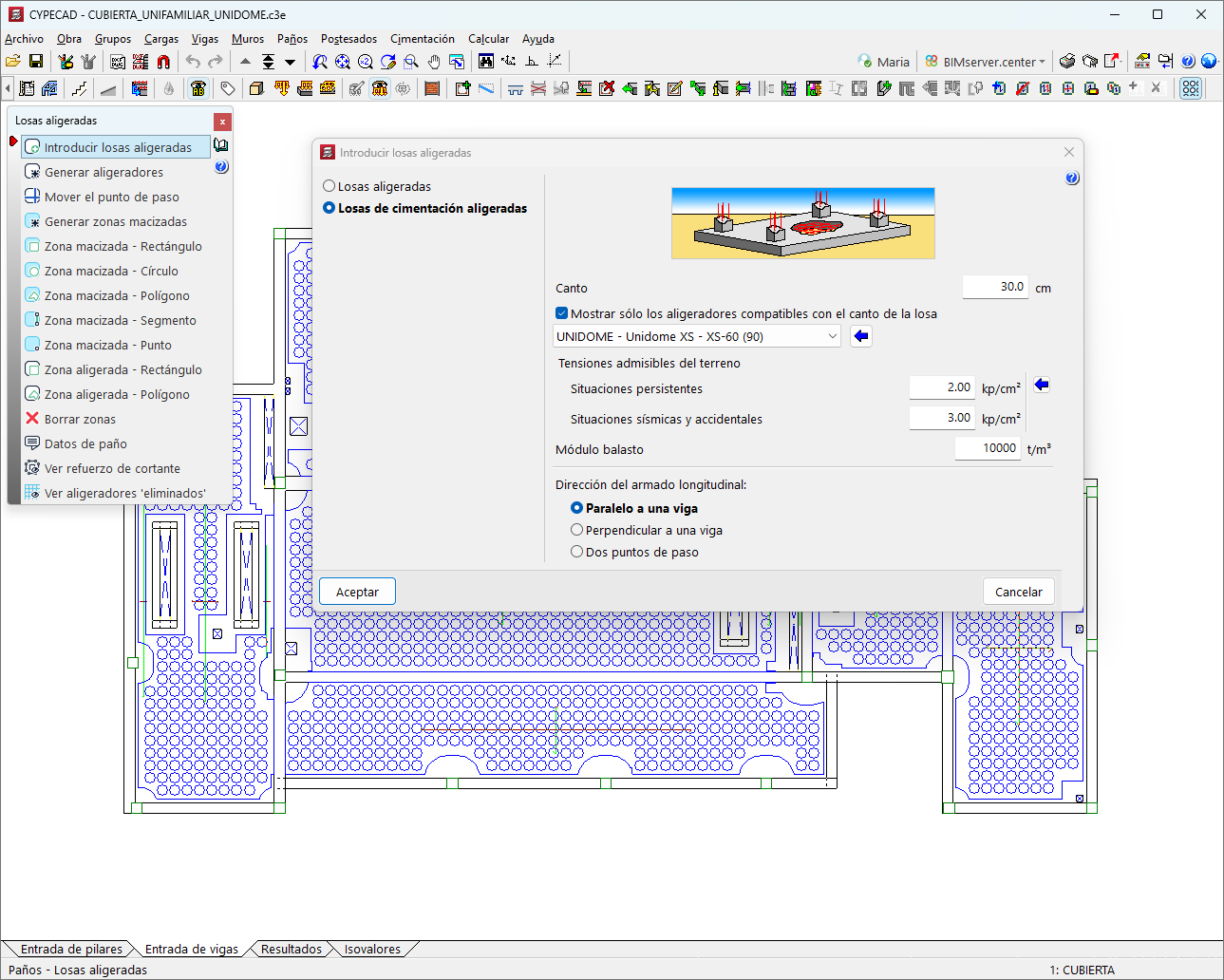 Insert this type of slab by selecting an interior point of the panel and a beam to define the direction of the reinforcement. To do this, users need to set the depth, select a compatible lightweight element (from the manufacturer's catalogue) and define the direction of the longitudinal reinforcement. - Lightweight mat foundations